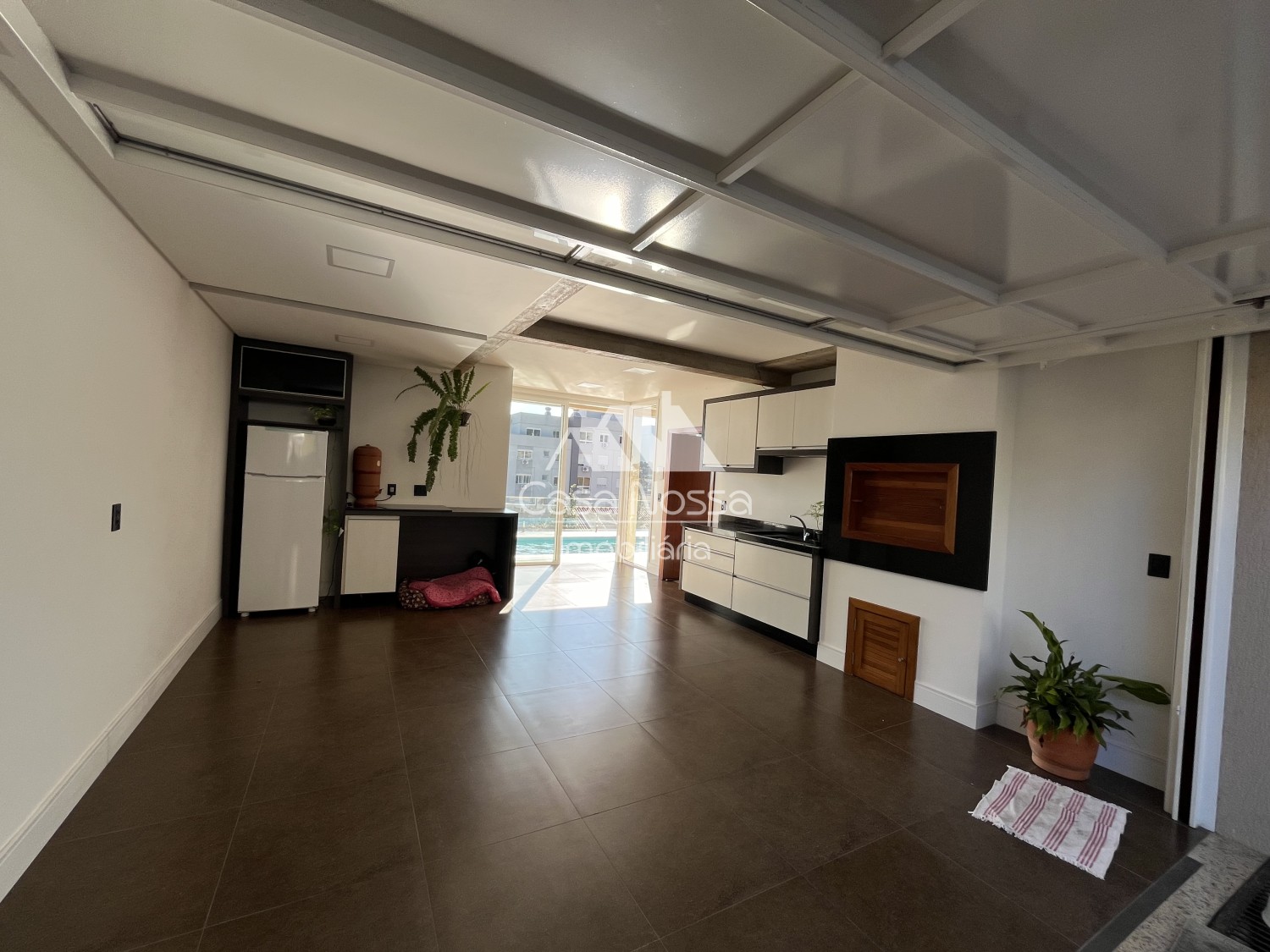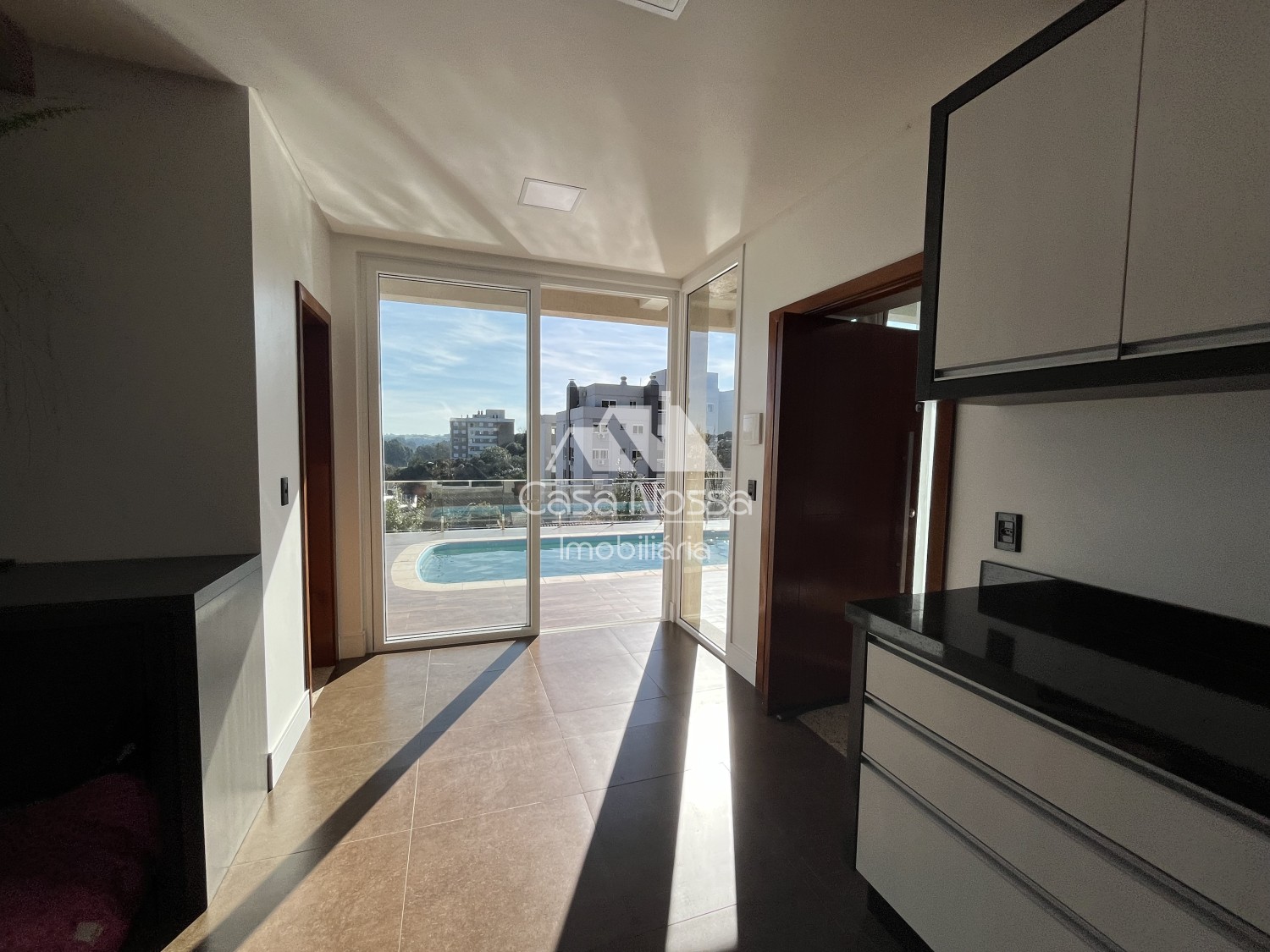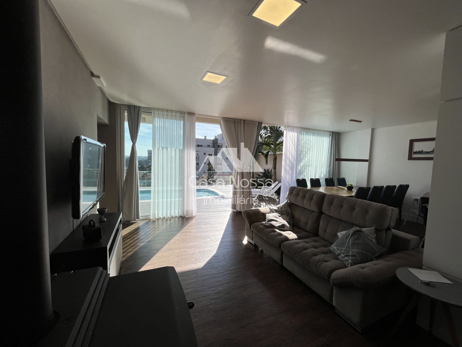 Ao entrar na casa, somos recebidos por uma vista espetacular, que se estende por toda a sala de estar e se integra perfeitamente à área da piscina. O ambiente é perfeito para receber amigos e familiares, seja para um churrasco à beira da piscina ou para um jantar elegante na sala de jantar.